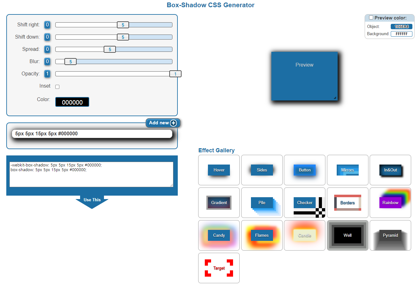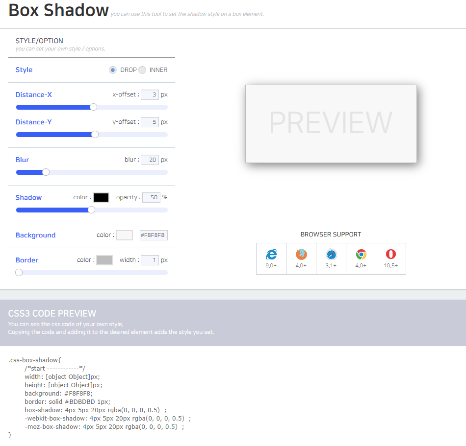 Set the properties of your box shadow to get the CSS style. Use the sliders and the color picker to set the values and watch the live preview