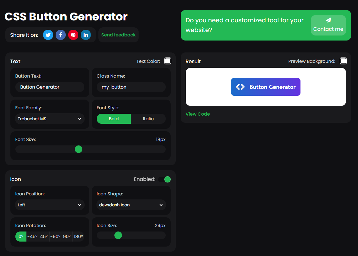 A free HTML & CSS button generator tool to easily create a fully customizable button designs for your website. Also you can add icons to your button to make unique.