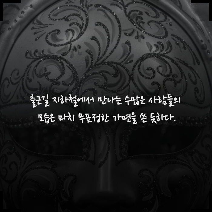 출근길 지하철 사람들은 저마다 무표정이라는 가면을 쓰고 있다.